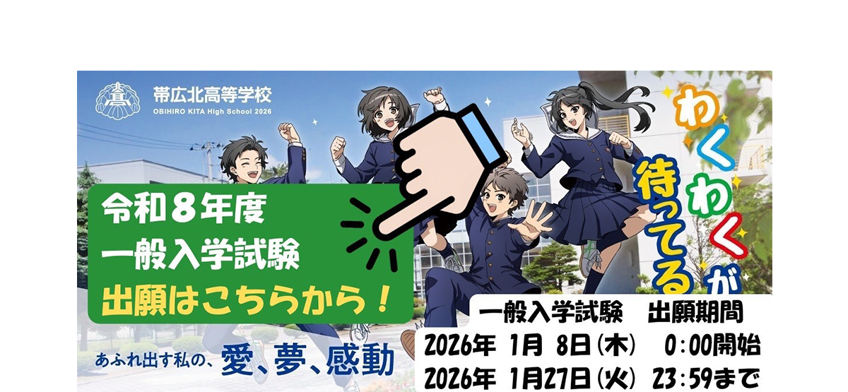 お知らせ すべて スクールニュース クラブニュース 入試情報 20261/14 クラブ箏(こと)部 お正月演奏会を行いました 20261/13 クラブ吹奏楽部 帯広渡辺学園創立110周年・帯広北高等学校創立70周年記念パーティーにて演奏しました 20261/5 スクール教育活動 新年のご挨拶 20261/5 クラブ書道部 新春イベント「お正月演芸パフォーマンス」に参加しました 202512/26 スクール学校行事 終業集会を実施しました 202512/26 クラブバドミントン部 大会結果報告<レスリング部> 20261/5 スクール教育活動 新年のご挨拶 202512/26 スクール学校行事 終業集会を実施しました 202512/23 スクール教育活動 本校生徒が「TOMOSHIBI〜灯し火〜2025」で最優秀賞・オーディエンス賞を受賞しました 202512/16 スクール学校行事 出張講義・施術体験会を実施しました 202512/10 スクール学校行事 ブース型進路ガイダンスを実施しました! 202512/4 スクール教育活動 帯広北高等学校 創立70周年 記念講演会を実施しました 20261/14 クラブ箏(こと)部 お正月演奏会を行いました 20261/13 クラブ吹奏楽部 帯広渡辺学園創立110周年・帯広北高等学校創立70周年記念パーティーにて演奏しました 20261/5 クラブ書道部 新春イベント「お正月演芸パフォーマンス」に参加しました 202512/26 クラブバドミントン部 大会結果報告<レスリング部> 202512/24 クラブ茶道部 豊成小学校の和ごころクラブの皆さんと茶道の交流会をしました 202512/23 クラブレスリング部 第42回北海道高等学校選抜レスリング大会 結果報告 20257/23 入試 2025年 オープンスクールのご案内 20257/2 入試 2025年度 夏休みクラブ体験会のご案内 More 特進コース 一人ひとりへの手厚いサポートが夢への扉をひらく。 総合コース 部活動や勉強、将来の夢も目標も。全力の高校生活! 進路室 学習サポート キャリアサポート 卒業生の声 進路実績 入試情報 受験生サイト ・推薦入学試験試験スケジュール、募集定員 ・一般入学試験試験スケジュール、募集定員、試験科目 学校見学・説明会 奨学金制度 入学金諸費用 スクールライフ 緑に囲まれた広大なキャンパスで知性を磨き、徳性を養い、心身を鍛える。 施設案内 制服紹介 年間行事 スクールニュース 動画 部活動 体育系クラブ 文化系クラブ 在校生・保護者・同窓会 行事・お知らせ PTA 同窓会