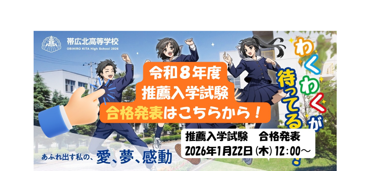 お知らせ すべて スクールニュース クラブニュース 入試情報 20262/2 スクール学校行事 3学年学年集会を実施しました 20262/2 クラブレスリング部 レスリング部 北海道高等学校選抜大会で学校対抗優勝 20261/19 クラブ吹奏楽部 第57回帯広地区アンサンブルコンテストでサクソフォーン3重奏が金賞、管楽6重奏が銀賞を受賞しました 20261/16 スクール教育活動 安全運転講習を実施しました 20261/16 スクール学校行事 始業集会を実施しました 20261/14 クラブ箏(こと)部 お正月演奏会を行いました 20262/2 スクール学校行事 3学年学年集会を実施しました 20261/16 スクール教育活動 安全運転講習を実施しました 20261/16 スクール学校行事 始業集会を実施しました 20261/5 スクール教育活動 新年のご挨拶 202512/26 スクール学校行事 終業集会を実施しました 202512/23 スクール教育活動 本校生徒が「TOMOSHIBI〜灯し火〜2025」で最優秀賞・オーディエンス賞を受賞しました 20261/19 クラブ吹奏楽部 第57回帯広地区アンサンブルコンテストでサクソフォーン3重奏が金賞、管楽6重奏が銀賞を受賞しました 20261/14 クラブ箏(こと)部 お正月演奏会を行いました 20261/13 クラブ吹奏楽部 帯広渡辺学園創立110周年・帯広北高等学校創立70周年記念パーティーにて演奏しました 20261/5 クラブ書道部 新春イベント「お正月演芸パフォーマンス」に参加しました 202512/26 クラブバドミントン部 大会結果報告<レスリング部> 202512/24 クラブ茶道部 豊成小学校の和ごころクラブの皆さんと茶道の交流会をしました 20257/23 入試 2025年 オープンスクールのご案内 20257/2 入試 2025年度 夏休みクラブ体験会のご案内 More 特進コース 一人ひとりへの手厚いサポートが夢への扉をひらく。 総合コース 部活動や勉強、将来の夢も目標も。全力の高校生活! 進路室 学習サポート キャリアサポート 卒業生の声 進路実績 入試情報 受験生サイト ・推薦入学試験試験スケジュール、募集定員 ・一般入学試験試験スケジュール、募集定員、試験科目 学校見学・説明会 奨学金制度 入学金諸費用 スクールライフ 緑に囲まれた広大なキャンパスで知性を磨き、徳性を養い、心身を鍛える。 施設案内 制服紹介 年間行事 スクールニュース 動画 部活動 体育系クラブ 文化系クラブ 在校生・保護者・同窓会 行事・お知らせ PTA 同窓会